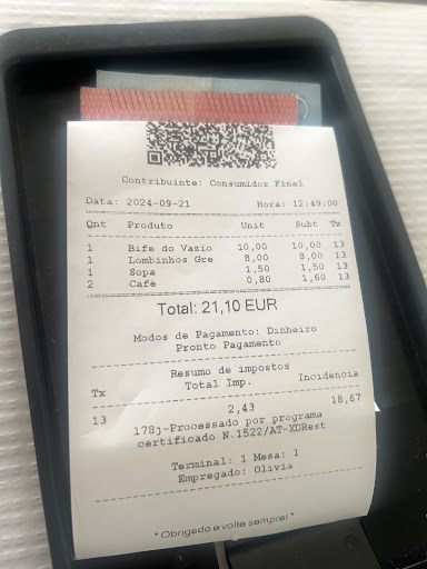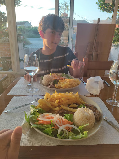 Sooooo happy to have found this place after walking for a bit on Camino. A little more uphill than usual today. Anyway, a wonderful, full English menu (thank you). My partner ordered vege soup and bread/butter. I ordered the tenderloin steak (pork) which came w a small salad, fries, and rice (or I added these items). Sauce was cream w mushrooms. Excellent food. Very kind hostess. A wonderful place to land after a morning walk. Finished with a coffee with leite. Yum!! Bring...