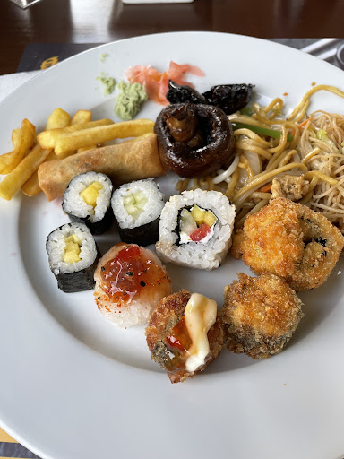 The atmosphere can be very romantic since they have a outdoors area with a view over the sea as well as a room with glassed wall with the same amazing view. The service is good, the waitresses are always around and are really helpful and quick to clean the tables when it starts to pile to many plates. For context it is a self service, free buffet, so yes, plates do end up piling up. That being said, when it comes to the food itself, it's good. They have a nice variety of sushi and hot dishes, such as chaofan (fried rice) and noodles. They also offer dessert and a selection of raw ingredients such as beef and shrooms that can be cooked for you. Overall I say this is a great place to go from time to time if your in the...