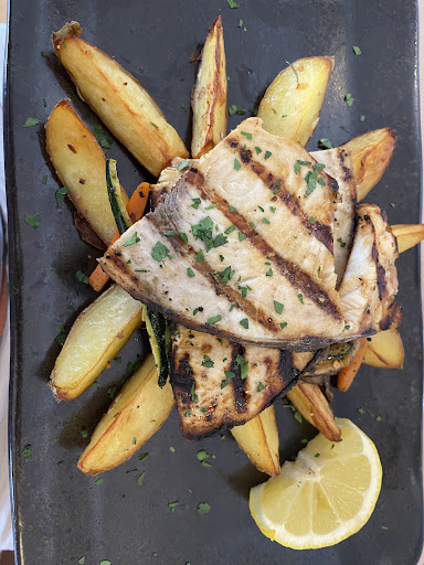 As a main we had the grilled swordfish, codfish from the oven and grilled squid. The grilled swordfish was delicious and came with 2 steaks, baked potatoes and very tasty grilled mixed veggies. The codfish was served with baked potatoes and 3 muscles. The squids were plentiful and served with homemade chips.