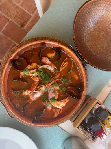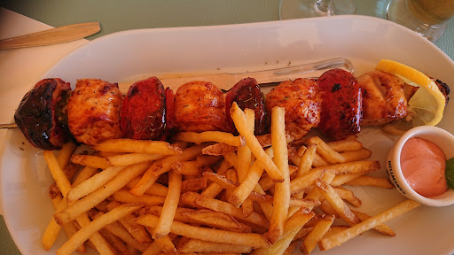 Read moreOver hyped. The restaurant is quite large with both an inside and terrace area; we elected to sit on the terrace and were shown to a table for two with excellent views over the bay and cliffs. The pleasant waitress took our drinks order of a bottle of wine and after delivering it took our meal order; a bowl of olives for starter, a monkfish and prawn kebab for me and lamb chops for my partner. We asked what the meals came with; just chips, so ordered a mixed salad to share. The kebab consisted of three tomatoes, three chunks of monkfish, three prawns and half of an onion, served with a large portion of frozen (cheap) chips The fish and tomatoes were fine but the prawns were still whole and had not been deveined; at the price I should have thought that they would have been prepared. My partners four lamb chops proved to be overcooked, tough and inedible; the waitress agreed to take them back to the kitchen who undercooked some more chops which were still tough. Full marks to the waitress and restaurant for trying to please. The mixed salad was quite good. For a bottle of house wine, olives and two meals, paying €80 for what was an undistinguished beach bar meal was way over the top; as residents we regularly eat out so have an appreciation of what to pay in these places. Be also aware that they do not accept cards so it is cash only (they have an ATM...