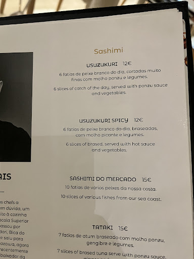Total bill (minus one 12 euro USUZUKURI SPICY which I refused to consume) was 64 euro⦠I left 70 euros for their ātroublesā. Overall WAY OVER PRICED for the food and overall lack of general service and attention.