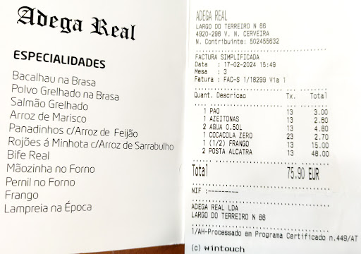 O forte das refeições é aos Sábados, em dia de feira semanal, com mão de cabrito no forno, pernil de porco no forno e bacalhau à minhota (também no forno), costeletão na brasa e arroz de lampreia (na época); em principio, qualquer outro prato demora um pouco mais a ser cozinhado. Tem vinho verde branco à pressão, para além dos vinhos maduros engarrafados. O restaurante, aliás como todos os outros das redondezas em dias de feira, é "assaltado" pelos espanhóis ruidosos, numa algazarra às vezes incomodativa, sejam os seus grupos grandes ou pequenos! A mãozinha de cabrito com batatinhas fritas aos quadrados - o nosso prato favorito -, estava saboroso, como sempre. O preço da dose para duas pessoas é agora (Agosto de 2022) de €38,00 (antes eram 30,00 euros). A refeição foi acompanhada por uma caneca de cerveja e por um jarrinho pequeno de vinho branco verde à pressão, taxado em 6,00 euros, um valor que considerámos francamente exagerado. Como entrada, apenas consumimos um pratinho de azeitonas e pão (duas pequenas fatias e duas tiras estreitas de broa de centeio). Não houve cafés nem outros extras. O valor da refeição (duas pessoas) rondou os 50,00 euros. No Verão, o pessoal habitual, sem deixar de ser simpático, nos almoços de dia de feira, não tem mãos a medir e anda numa azáfama. No Verão de 2022, foram admitidos empregados oriundos da Venezuela para dar uma ajuda no serviço pelo que é de admitir, pela evidente falta de experiência que demonstram, alguns enganos e troca de pedidos entre as muitas mesas que se espalham pela grande esplanada no átrio da Igreja, em frente da entrada do restaurante. Há salas no interior, no primeiro andar e no andar da cave. Não existe rés-do-chão porque a entrada dá logo acesso a dois lances de escada, um que leva à sala do primeiro andar e outro que desce para a sala da cave. Apenas duas notas negativas, registadas em Agosto de 2022, que justificam a perda da quinta estrela na classificação: Em dias normais, isto é, em dias em que não há feira, as opções de pratos são reduzidas e as quantidades também. Como exemplo, num almoço tardio (após as 14:00 horas), num desses dias de semana, com o restaurante sem clientes, pediram-se panadinhos de porco com arroz de feijão para duas pessoas. Como o arroz de feijão era escasso, pediu-se mais um pouco; veio arroz branco porque já não havia do outro (ou porque pouco sobrou do almoço ou porque pouco terão confeccionado por não esperarem grande afluência de clientela). As casas de banho, em dias de feira, não recebem a atenção devida e os papéis higiénicos e das mãos, espalham-se pelo chão, após se esgotar a capacidade dos respectivos receptáculos, tal como acontece com o sabonete líquido! À atenção da gerência: num restaurante, uma casa de banho descuidada na higiene faz o cliente duvidar do estado de limpeza da cozinha...