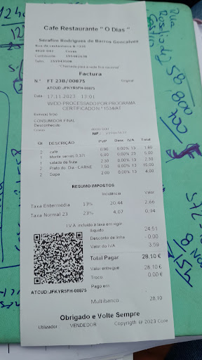 Read moreFiquei parva, sou comercial e como tal almoço todos dias em diferentes zonas do país, contudo qual o meu espanto neste estabelecimento que me dizem que tem diária mas só para pessoas que a reservam semanalmente ou mensalmente, contudo fiquei para almoçar com meu colega, prato do dia arroz com legumes e costuletas grelhadas, eis o que foi pedido, 2 pratos de arroz e carne 2 sopas 2 cafés 1 garrafa de vinho 0,37 cl 1 salada de fruta Total 28€ Nunca vi semelhante em 10 anos de comercial. Uma pequena nota, arroz completamente melado, carne super fina e com sabor estranho. Fica a nota.. nunca mais. Pena a ASAE não fiscalizar estes...