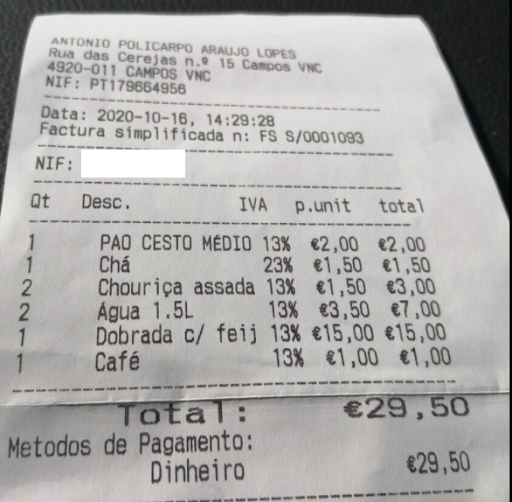 Read moreFui almoçar a este restaurante apenas porque outros não tinham pagamento multibanco. A única coisa boa que lá tem é o pão de milho com sultanas. Pedimos feijoada que era um dos pratos que estava a sair, a cenoura estava literalmente crua, as carnes sabiam muito, mas muito mal mesmo, a pior comida que comi na vida. No fim ofereceram-nos castanhas, horríveis também. Pedimos 2 descafeinados e a conta, qual não é o espanto quando nos apresentam uma conta escrita à mão de 29 €, onde 2€ eram das manteigas, 3€ de pão, 7,5€ de 3 ice teas, 2€ dos descafeinados e 15€ da feijoada, pedi fatura e só depois é que vi o que faturaram, não tinha nada a ver com o que nos cobraram, ver imagem em anexo. Ladrões...
