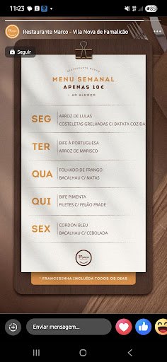 Read moreUma estrela na avaliação por não ser possível dar zero. Optamos por almoçar no Marco depois de consultar nas stories do Facebook os pratos disponíveis no menu do dia. Hoje, quarta-feira, folhado de frango ou bacalhau com natas. Pois que nos dizem que os pratos são "panados de frango com arroz de legumes ou arroz de marisco". Quando questionamos sobre se há os pratos divulgados a resposta é "ainda não". Não refletimos muito mais apesar de estranhar e pedimos os pratos disponíveis. Quando fomos pagar, reparamos numa mesa um senhor a comer folhado de frango. Depois de pagar questionei o funcionário, até para perceber de futuro como funciona. A resposta foi "pois, o que está publicado é o prato do dia, mas há outros primeiro para acabar". Quando questionei "então só servem os pratos do dia quando despacham outros que têm de gastar?" o senhor disse "olhe está ali o patrão, se quiser fale com ele!"