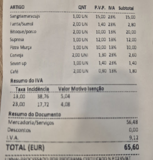 Read moreEntramos para jantar sem expectativas, após experiências não muito positivas em restaurantes perto deste. Pizzas muito bem confecionadas, massa caseira e bem recheada e temperada. Pizzas muito saboras, uma surpresa nesta zona. Pedimos também bitoques de porco, igualmente muito bons. Febra tenra, acompanhada com ovo, batata caseira e salada. Tudo muito bem servido. A cereja no topo do bolo foi a sangria de maracujá, que estava igualmente divinal. Tudo isto por preços muito justos e acessíveis, para quem quer comer bem e não pagar muito. Sem duvida o melhor restaurante que visitamos nestes dias em foz coa.