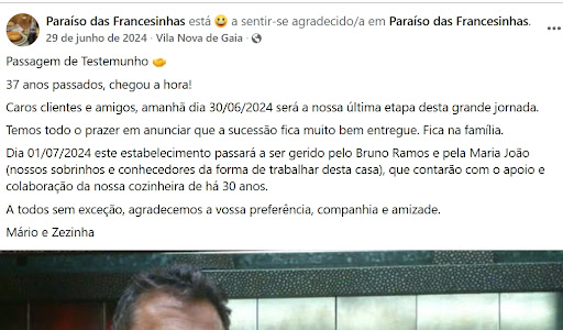 mais acrescento, (com print foto anexa),vossa publicação pública em redes sociais: Em resposta à minha crítica, o proprietário afirma ter ficado com o negócio dos padrinhos, como se fosse uma transição direta e pessoal. No entanto, numa publicação oficial da própria página (imagem anexa), é indicado que o estabelecimento passou para os sobrinhos, o que é uma narrativa diferente. Esta contradição levanta dúvidas sobre a transparência com que se comunica com os clientes — e demonstra como se tenta controlar a percepção pública, especialmente quando surge uma crítica negativa. Não recomendo. Tive uma má experiência. Mas, para ser sincera, também é indiferente — o senhor Bruno faz o que bem entende. O negócio é dele, e as opiniões dos clientes não parecem importar. Não passa fatura. Dão um preço por telefone e, na hora do pagamento, é outro. Não há transparência nos preços, como...