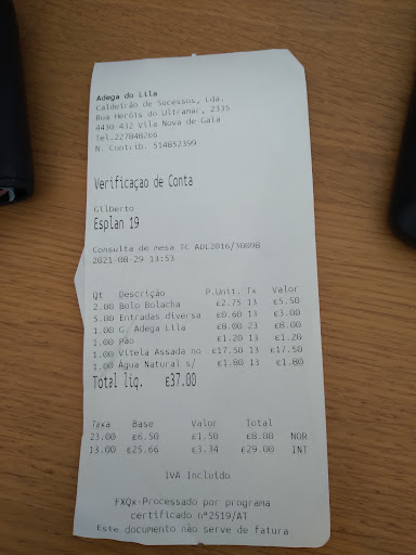Read moreServicio lamentable, empieza bien pero cuando el restaurante se empieza a llenar lo que es común un domingo se vuelve caótico y lentísimo. Mas allá de eso nos engañaron con las entradas. hace rato que vivimos en Portugal y sabemos que los restaurantes colocan las entradas en la mesa para que uno se tiente. Si las pruebas se cobran. Este restaurante nos Cobro las entradas sin haberlas tocado y devueltas al camarero. un engaño y robo a toda regla. Adjunto el comprobante de mesa que también seguramente se han "olvidado" de facturar ya que es solo una comanda. Así cualquiera hace dinero y lo peor es que se llena de gente y tiene además multitud de pedidos para llevar. Si nos cobraron de más pensando que éramos turistas peor para ellos porque merece una denuncia formal que posiblemente hagamos. En cuanto a la comida muy normal el plato principal, los postres son industriales y de la peor calidad. El vino es de garrafa y lo traen ya abierto como en el mesón del barrio pero cobrado a 8 euros. Nunca más volveremos a ir. Si de casualidad andan por Gaia y pasan por Balteiro (lo dudo) No entren a este lugar. Este tipo de gente hace quedar mal a los...