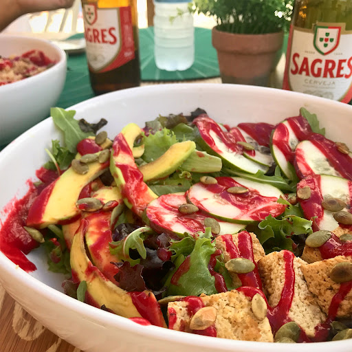 If you are in the mood for other culinary delights during your stay in the Algarve, in addition to the fish dishes offered everywhere and those of Iberian pork, and you are also a vegetarian, then we recommend a visit to the GREEN BUDDAH restaurant in the city center of Vila Real do San Antonio. This small restaurant offers space at six tables for four people each and also has a few seats in the tastefully furnished interior. Mainly Asian dishes can be found on the menu, but various international dishes are also offered. We noticed, among other things, Mexican dishes. We opted for very tasty smoothies made from fruit and vegetable juice, and we also ordered 1x Teryiaki chicken and a Marrakech bowl. Banoffee and a piece of nut cake as well as espresso formed the end of a very tasty and well-presented sequence of dishes. The service was very courteous, professional and pleasantly approachable and friendly. In our opinion, the prices are moderate and it is surprising that they are not a little higher since the quality of the food is very good. Conclusion: a successful evening for us and an urgent recommendation for everyone who is a little tired of fish and pork dishes and who want a change!