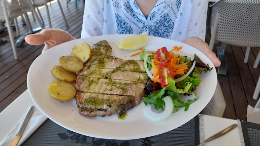 Had just checked into a nearby hotel and need some food so walked along the boardwalk. All restaurants had fantastic views of beach etc. This was one of the few that were actually open. One or two people already eating and menu outside tempted us in. Gaspacho (tomato and garlic) soup for a starter which as you know is served cold yet still took 10 to 15 mins to serve. Main was the mixed grill which apart from the red hot burn your mouth sausage was tepid to say the least. Chips were cold within minutes of it being delivered and some meat was fatty even the plates it was served on was cold If it not been for its location I would have...