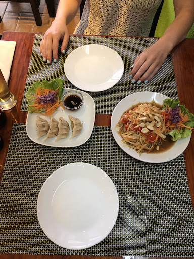 Ruan Thai has a very nice atmosphere, comfortable chairs, relaxing Thai music, decorative lights and is very clean. The staff are very friendly and attentive. We ordered Som Tam, Chicken Gyozas, Shrimp and Chicken Pad Thai and a mango sticky rice to finish off.