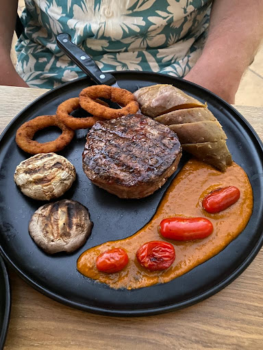 Main course: Steak 28€. Ordered medium rare, got a medium one and likely could have rested a bit more. Seasoning of the meat was good, with a small burnt crust that added well. Basic condiments (mushroom, asparagus, onion rings and grilled whole potatoes) were done well. Could have added a bit more sauce though. Size was good enough for me (105kg male).