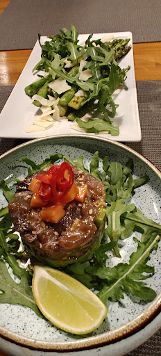 Starter 1: Tuna tartare 11€. Great taste, a tad warm to my liking, but carefully thought out. Avocado and small bits of carrot (great add-on, worked well) and some rucola. Perhaps a bit too much rucola but good balance.