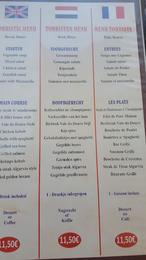 Read moreVanavond zijn we gaan eten in Valle Do Duro. We waren iets aan de vroege kant kwart over 6. Aan een ober die aan een tafeltje het bestek in rolletjes servetten zat voor te bereiden vroegen we wanneer ze open zouden gaan. Antwoord was 7 uur. De eigenaar die net naar buiten kwam hoorde dit en zei geen sprake van u kunt nu al plaatsnemen. Dus zo gezegd zo gedaan. Kregen van de zoon (denken wij )?. De menukaart waarop een flinke keuze uit diverse gerechten. Erbij zat echter een kaart met het toeristenmenu voor €11,50 . (Zie foto). Onze keuze was een salade en een groente/pompoensoep welke we kregen na het mandje met 2 warme broodjes met boter. Als hoofdgerecht namen we de kalkoen met champignonsaus en de kipspies beide met friet en groenten saus. Uit een ruime keuze als nagerecht kozen we voor een flinke punt appeltaart. Een drankje zat hij de prijs inbegrepen. Buiten deze drankjes namen we nog 3 biertjes. Afgerekend € 26.50.!!! Verwacht geen culinaire hoogstandjes voor deze prijs maar wij hebben heerlijk gegeten. En een compliment voor de attente en...