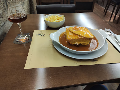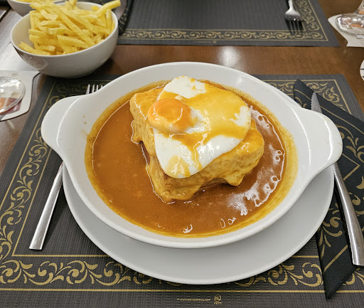 Read moreFrancesinha com mais fama do que sabor... Fui duas vezes. A primeira vez foi há coisa de 4/5 anos se tanto. Francesinha estava até boa, ambiente sossegado (sei que depende dos dias) e uma panacota deliciosa! Atendimento bastante bom e rápido. Fui lá recentemente... Entradas vieram quase ao mesmo tempo que as francesinhas. Mas tudo bem, as francesinhas fumegavam, uma pessoa deixa arrefecer, também não era por aí... Pedi o molho à parte, veio o molho já na francesinha. Molho picante no limite da minha tolerância, mas se baixarem um pouco, não fazia mal nenhum. O pior foi quando comi os camarões... Estavam frios e sem dúvida alguma que aquele grandalhão que colocaram por cima, tinha mais de 2/3 dias. Dei ao meu colega para cheirar e estava realmente esquisito. Não reclamei porque demorou imenso tempo e esperar outro tanto estava fora de questão. Mas fiz mal em não ter reclamado e ir embora sem pagar. As batatas com o molho vão bem. O ambiente era extremamente barulhento. Uma pessoa tinha de esticar o pescoço para saber o que o outro dizia. Estava...