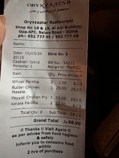 Read moreDeleting my previous review as I no longer have anything good to say about this place. This used to be one of my favorites in Salwa Road & innumerable times Iâve overlooked the downers like slow service, mediocre taste or small portion size,because it happens. Shame on you & your staffs for discriminatory behavior! That too at a moment when the restaurant was noticeably less crowded. We requested for the corner seat & we were told due to weâre being less in number that table couldnât be given. Moments later a family of 4 moved to the same seat from their previous table & they didnât have adequate number of people to fill the seats either. Their children werenât any younger than mine. Why were they allowed & not us ? Because they speak same language as you do ? We can not choose a seat while other families can. Shame on you ! I immediately stormed out of there wasting not even a minute & made it to Alishan restaurant & let me tell you, Oryx Zatar doesnât have the iota of gracefulness that Alishan does. Keep your nasty attitude & mediocrity to yourself. I donât deal with people or business with...