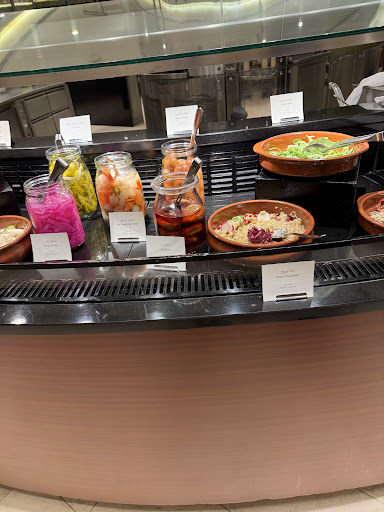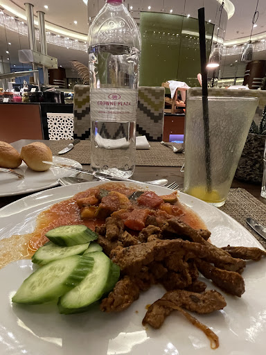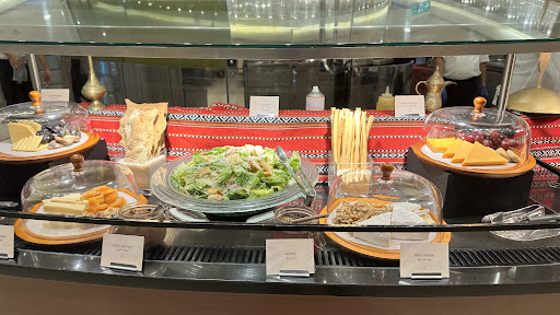 Read moreWe visited them on Sunday night, hoping for a nice variety of international cuisine. The items offered in order were Tom yum soup, white rice, Daal, Fish curry, lamb with some veg curry, chicken bbq, cheese and bread selection (no deli meat in sight, none was refilled while we were there), some veg curry, then salad station, live pizza station, mince sambosa, spring rolls, pasta with tomato sauce and misc Arabic salads. For dessert, there were fresh fruit, creme brulee, chocolate mousse, strawberry cake with a few more choices. Drink choices were water, soda and fruit juices. Service was wonderful and that was the highlight of our night. I wish we could say that about the savory choices too, but apart from the salads, we were not back for seconds (totally not usual for a buffet dinner). By the time I went for dessert, most of the items were finished and there were no chocaye options. A waiter asked what I'd like and I mentioned chocolate, so he got me a delectable chocolate brownie and it was extremely delicious (from the bakery). Even those who went to get dessert after me asked for the same to be served to them. Please upgrade your menu to make it "International". I had visited expecting Sushi based on the reviews we saw on Zomato and there was none to be found. Some dishes when they finished were just not refilled for the customers who dined in say at 8pm or 9pm, given that the buffet is on till 10:30. I will again comment that the service was really really good and each and every server ( served by 6 different people) were polite, very accommodating and made our...