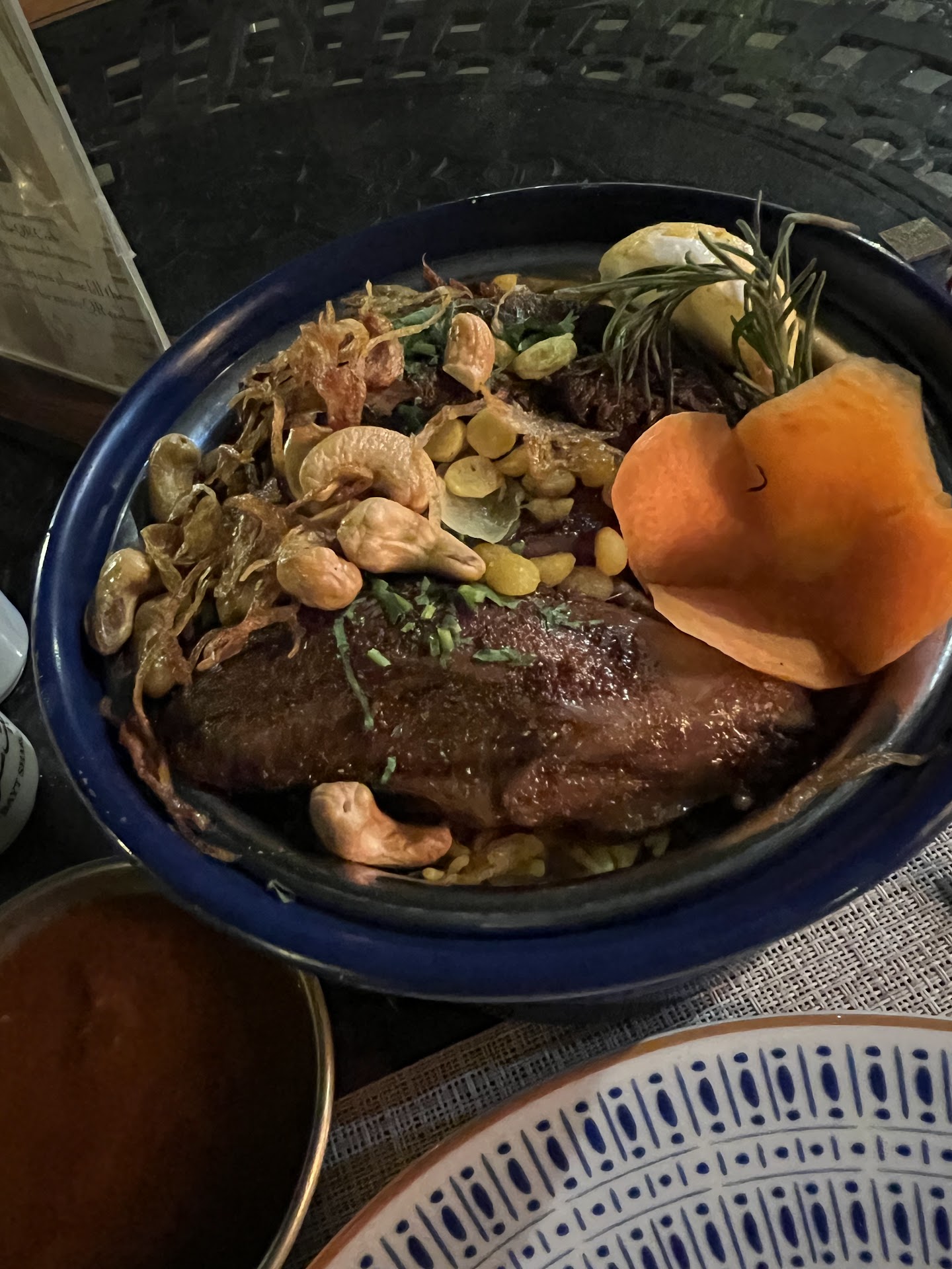 We went off hours around 4 so there was ample parking and not many guests. The weather was beautiful so we decided to get a table outside. We were a large party and there were many options for us to chose from including private majlis. The grounds are extremely well kept and ideal for small children to play while the adults get some time to converse. We were hungry and the food looked absolutely delicious when it came and we forgot to click pics of the food. Food: Mix fatayer - There were 3 each of the zaatar and cheese fatayer and it was fresh and good Mixed Grill - This was my least favorite dish. The lamb chops were quite tasty but the chicken tikka, shokaf and the baby chicken were too dry. Majboos Dajaj - Tasty and flavorful Mashwi Jadar Badawi - This was the best surprise from the late lunch. Tender lamb, aromatic and flavorful rice mixed with the saffron sauce. It was absolutely delicious. Mohammar rice with fish - The fish was fresh and grilled perfectly garnished with a mix of chopped peppers. I didn't care for the rice so much but the fish compensated for it completely. Karak chai - Although unsure how this would be, it also turned out to be surprisingly tasty Tea Pot - This was unfortunately disappointing. We'd asked for mint tea but it came without. Although they got mint leaves later to add, it's really not the same thing without proper infusion. The tea itself was also towards the bitter/stronger side. Presentation however was spot on along side the theme of the place.