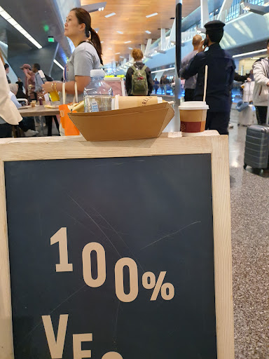 4* for service and atmosphere: you are understaffed, guys. Airport is a very crowded place and customers flow is non-stop. The team is struggling taking orders and cooking at the same time. As many cafe visitors are disrespectful, they leave all the trash on the tables, chairs and even on top of the entrance board (where it is written 100%vegan) and the crew not always is able to clean everything on time. So even the ambience is nice, it is not pleasant to seat surrounded by piles of trash. You cannot change the behavior of ignorant people , who don't use the the waste bins provided , so , please , give some extra hands to maintain the cleanliness...