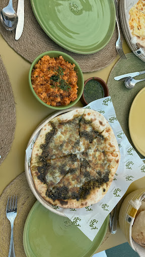 Read moreDelicious breakfast! There were two of us, and we ordered the "Khamira Breakfast for One" which includes plenty of bread, six dips, an egg (cooked to your liking) and a small plate with fresh cucumber, tomato and radish. We also ordered scrambled eggs and a 'halloumi pesto manakesh' (which looks like a pizza in the photo). Along with that, we had two orange juices, a coffee and a karak.