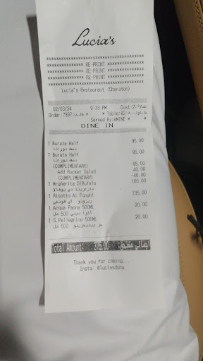 Read moreBeing in Doha for a short time, I naturally wanted to visit a restaurant with national cuisine, but I was advised to visit Lucia's Doha, an Italian restaurant. I went there 2 times, because being at Lucia's for lunch and being at Lucia's in the evening are two different experiences. So let's start with lunch. I would like to say that Lucia's Doha is not only about delicious Italian food, but also about professional service and the feeling of Italy in the desert. Real Italian coffee with a view of the sea, beautiful views, and the exquisite interior of the restaurant itself. It's nice that the waiters and the management take care of you and help you with your food choices. For me, not only the taste of food is important in a restaurant, but also the atmosphere. So, special respect to the restaurant manager, who personally comes to your table, takes care of each client and this is an extraordinary feeling that you are the main guest of the restaurant. Now about dinner at Lucia's Doha - this is a completely different Lucia's. Dinner at Lucia's Doha is an Italian show in which you can also take part if you wish, it is about the restaurant manager who personally prepares cocktails and pasta for customers and this is also part of the show, but let's not forget about the wonderful delicious food from the chef of Lucia's Doha. So, I heartily recommend Lucia's Doha and special respect to the restaurant...