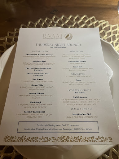 Overall, the Thursday night non-veg brunch at Rivaaj is a must-visit for food lovers in Doha. The exceptional quality of food, attentive service, and vibrant ambiance make it a standout dining experience. Perfect for a relaxed yet indulgent evening with family or friends....