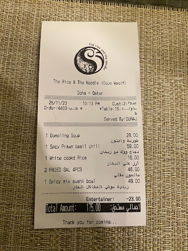 Read moreFirst time eating here and will not eat here again, we ordered dumpling soup, spicy prawn basil chili(the taste was really bad (this is a main course)), white rice, cheese & fried salmon(a main course as well we ordered the 4 pcs which is 23 QAR only), and spicy mix sushi bowl. Before entering the restaurant we asked the waiter if they accepts Entertainer voucher and he said yes, we had a 2 main course buy 1 get 1 45QAR voucher. When we are about to pay they got us confused with there entertainer voucher discount rules telling us that we did not ordered 2 main course even the cheese & fried salmon rolls and the spicy prawn basil chili are main courses, instead of deducting the voucher which is 45 QAR, they insist on telling us that we can get another cheese & fried salmon rolls for free so we can avail the voucher so they deducted only 23 QAR, I am not an expert with using this vouchers because we just used this for the 2nd time in this restaurant , we used this entertainer voucher at first in RAMEN restaurant and everything was smooth and we ordered 2 main course and one main course was for free even if the price was more than what was on the voucher. That is why the experience here in rice and noodles restaurant souq waqif branch aside from the taste of the food and the service was not good as well, imagine the waiter was not attentive when we finished paying the bill he told us why you did not inform me that you have entertainer voucher and we were shocked, and told him that we did inform you from the very beginning. I am not usually writing comments in restaurants but paying 175QAR for food it should at least...