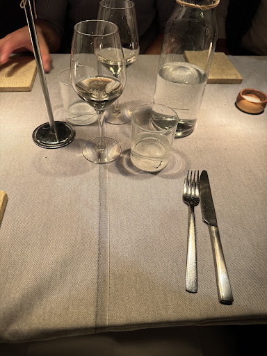 I don’t know if we were just unlucky that night, but the service was quite bad for different reasons. the commis (assistant of the waiter) had no charisma, no attention to details (see, for example, the placement of cutlery on the table in the picture) and always had us pass the plates to them at the end of the table when cleaning up. Zero effort from their side. it seemed like the main waiter did not really know what they were doing when serving wine. For the wine paring, especially for white, the amount of wine was really low, something like 7-8cl, but when serving red wine the glass was filled with at least 15cl. When paying over 500,- for 4 glasses of wine, please don’t give me the feeling of being tight-fisted for a glass of wine. another waiter who came help serving/cleaning the last two courses was clearly tipsy/drunk. First, when serving the course, they shouted “WHO’S HAVING THE TASTING MENU?” in a completely calm environment, then he became even more uncouth as the evening progressed. lastly, after serving the dessert, the waiters disappeared. They did not even come to clean up the table, until the main waiter passed by (dressed to go home in sweatpants) and we stopped him to ask for coffees. In my experience, the service shouldn’t stop at least until the coffee cups are cleared from the table.