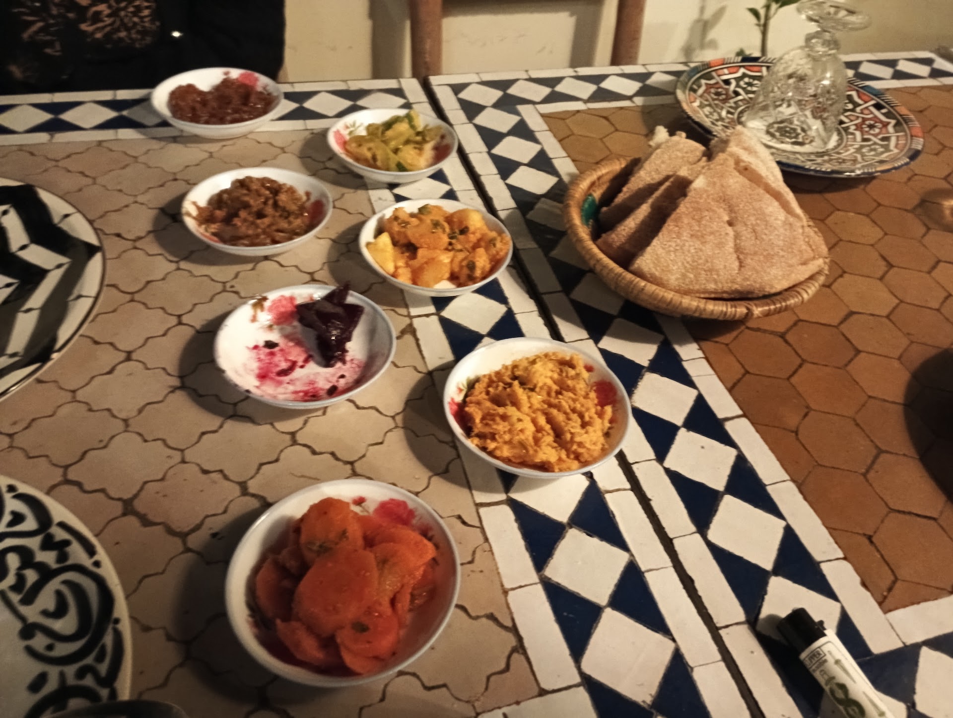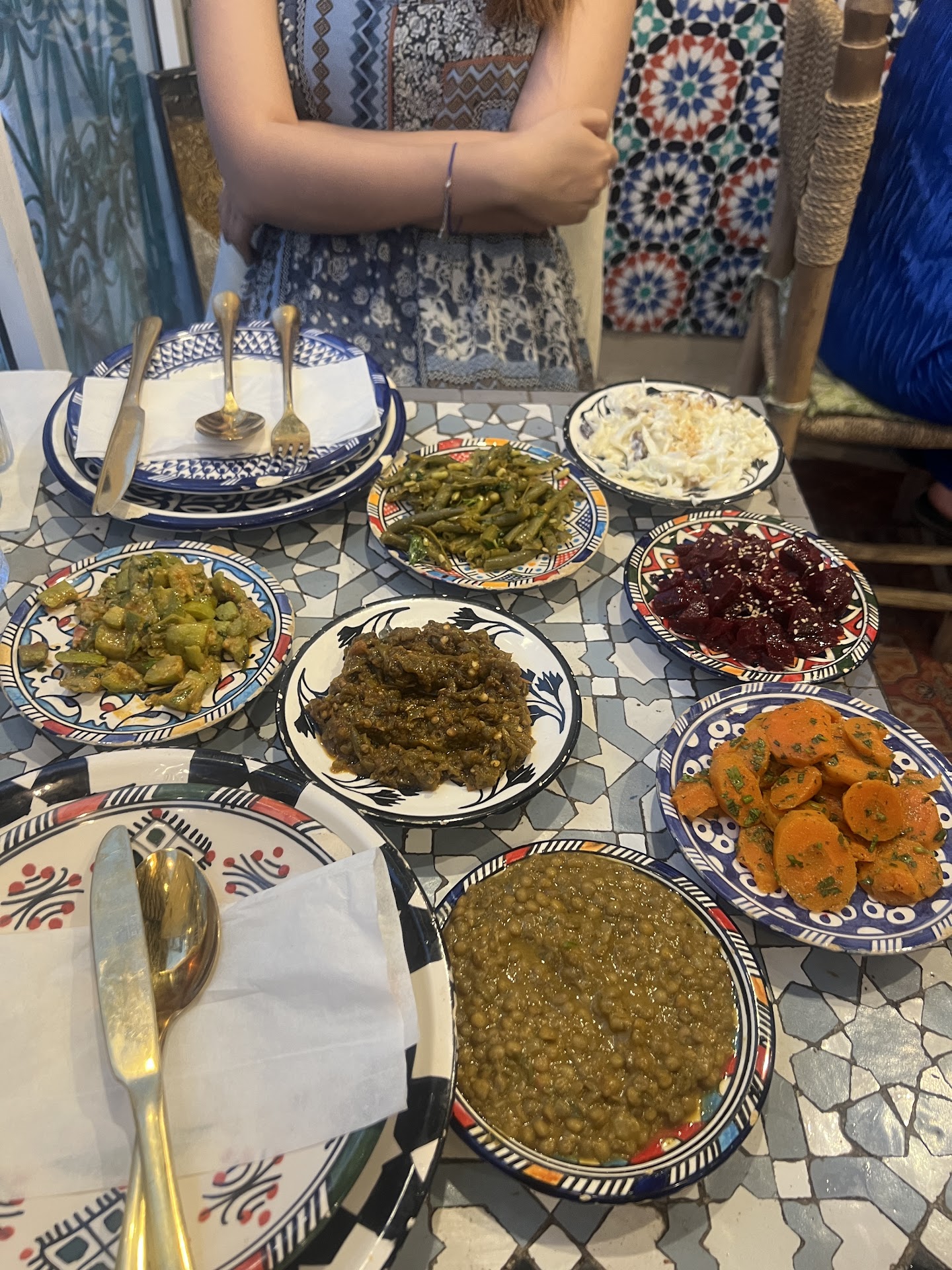 Once we got there Adnan (one of the sons) told us they have a guest house and live in the house next door. He and his family run the place with his mother and uncle as the chef and him and his brother and cousins as the servers. It suddenly got very busy and the boys were running up and down the 5 flights of stairs to make sure the guests were comfortable. The starters included in the menu seemed like too much so we only ordered one menu and I’m glad we did. We had so many starters with loads of vegetables in different sauces and salads. The tagine with chicken was also very good seasoned and so tasty. It really felt like being a guest of their family. For desert they had home made pudding. They at first forgot our tea a couple of times but as it was very busy it was understandable and they apologised profusely. They even ended up offering us a discount but since the food was so good and the view and atmosphere was amazing we did not mind one bit. All in all we enjoyed our dinner here and will absolutely...