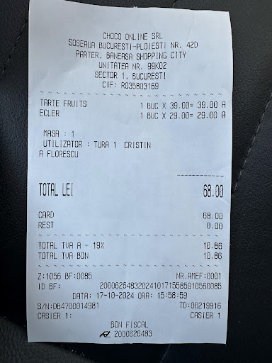 Read moreOfer - 100 de stele pentru felul in care am fost servita de acest domn angajat ( numele ii apare pe bon ) , cu o aroganță iesita din comun, lipsa de respect si profesionalism. Parca vindea varza la Pucheni ! O uitatura de interlop si gesturi asemanatoare. Daca intelegeti unde bat.. Mi a aruncat si bonul pe masă ! Oribil. Nici doamna care l-a ajutat cu impachetatul n-a avut mai multa prestanță dar macar a fost amabila. Mie imi place Chocolat dar cu asemenea vanzatori ma lipsesc. Eu nu comentez pretul calitatii produselor, altceva mă deranjează la maxim - ca nu suntem serviți cum trebuie de banii ăștia ! Șefii mari, faceti ceva, mergeti deghizati , trimiteti pe cineva clienți.. nu stiu. Am invatat o treaba - in Romania nu conteaza ca mergi la scump sau la ieftin. Esti tratat la fel. Esti .. pe bani multi. Pt ca nu se pune pret pe client. Ps. - tarta tiramisu care e trecuta altfel pe bon ( tartă fruits ), nu-și justifica pretul de 40 ron. N-as recumpara. Acum cativa ani eclerele aveau o crema mult mai densă, iar acum nu prea mai e asa- nici pe acesta n-as mai plati 30 de lei. Cele de la French Revolution sunt...