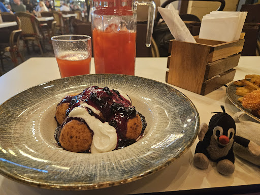 The service: 👎Obvious Tourist trap with a bad aftertaste. Should have known that this was the case when I saw the employee standing in front of an open menu trying to get the people off the street and onto the very very small tables with promises for various options in the menu. After 5 days on the road, I did not want any more burgers, pizzas, pasta or fries and I was looking for some vegetarian option and I was assured that there would be Vegetarian soup by the employee on the street. This was the second sign that something was wrong. There's almost no restaurant on Earth that offers soups for dinner. Anyway, the hungry tourist in me overruled the reason and we decided to stay and get something. We had to switch one of the chairs since there was a wet spot on one of them. But the juice stain on the table sat there the whole time.
