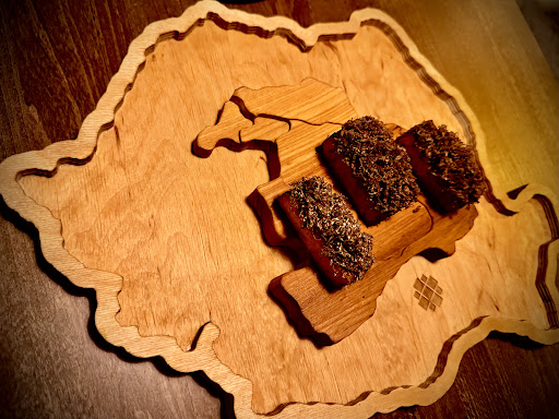 Appetizers are presented playfully, using a wooden map of Romania divided into pieces. Each piece represents a region, and diners complete the puzzle while enjoying the starters, providing a comprehensive view of the country and its flavors. I particularly highlight a crispy tomato-filled delight, delicious and memorable.