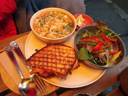 My sandwich was soggy and covered in grease. I felt as if i wasn't chewing on cheese but a rubber sole. The bacon was cold and rubbery, too, and everything was covered in grease to the point that my sandwich tasted oily. The omlette was tasteless and brought nothing to the sandwich. The food was lukewarm at best and cold at worst. The peanut butter and milk drink i ordered was executed poorly, even if, in theory, it sounds interesting. The saving grace of this meal was the desert, which is simply mediocre.