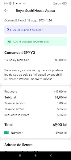 Am făcut aseară o comanda și i-am rugat pe cei de acolo sa nu îmi pună Wasabi și sos de soia că nu îmi plac și să îmi pună sweet chilli daca se poate desigur ,la telefon a răspuns o doamna care a zis că a văzut comanda mea și a zis că vor rezolva . In schimb am primit Wasabi și soia sa îmi pun și în cap. Am mai comandat de aici și nu e prima data când primesc altceva decât ceea ce am comandat. Ulterior am sunat la ei și răspuns a fost ( avem prea multe comenzi ) Ok felicitări ! Eu nu voi mai comanda de aici sa numai aveți așa multe comenzi și să puteți ține cont de cerințele clienților. Doamna de la telefoane și puțin înțepată aseară când am sunat. Plus că sushi cu ton și cel cu anghila aveau un miros neplăcut fata de alte dați.. am mâncat 10-15 sushi din 32 buc. V-ați stricat de la personal până la calitate ,...