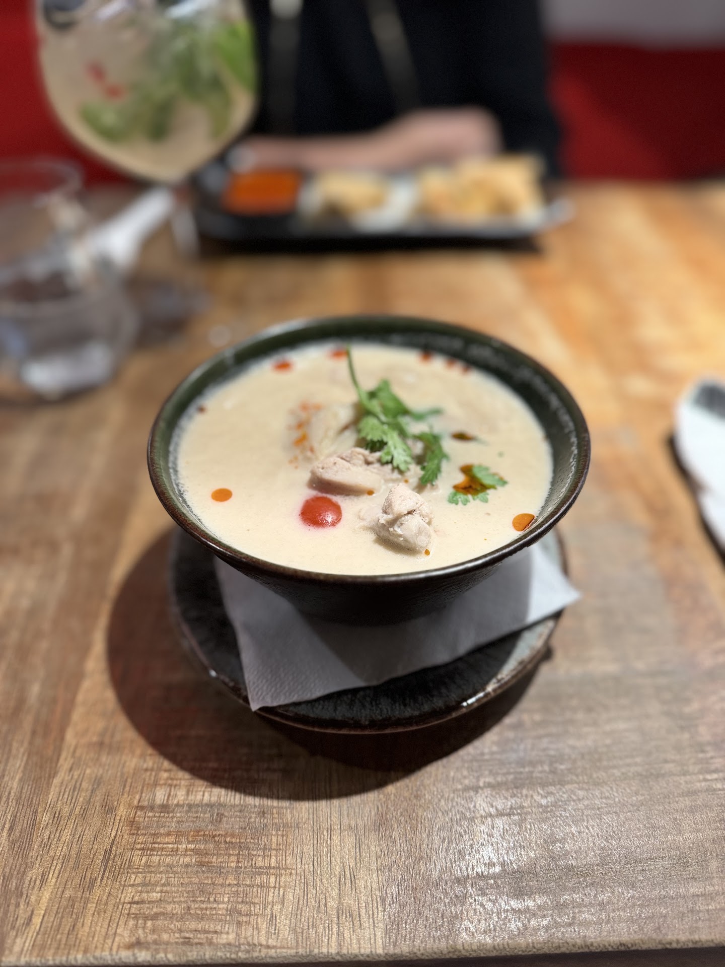 We passed the restaurant twice yesterday and it looked really nice so we planned go to eat there for dinner. Reservation was easy through their website. Arriving the first thing we liked was that, unlike most other restaurants in the vicinity Tom Yum had great music and it was not to loud👌🏻 You were able to have a conversation without yelling at each other☺️ We ordered some starters and were already amazed on how fast the kitchen was working. The Tom Kha Soup and the spring rolls were amazing and brought back memories from my visit in Bangkok. The Drunken Noodles were insanely good. I love spicy food but there is good spicyness and bad spicyness. This one was great!!!🥵😤🥰 For dessert we had mango sticky rice. Also great. (The only proposal I would give would be to change the way you serve the mango. The bits were too big to scoop up together with the rice just using the teaspoon. Maybe mango slices instead of cubes and serve with a small fork?) The employees were super friendly and I heard from other tables that spicyness is optional (most of the dishes have a lot of chillies as a sign of spicyness🌶️🌶️🌶️). Observing the staff showed that they seem to have fun working there 😜. Our waiter was literally never standing still. From sorting the menus and bringing them in order to having a look around the restaurant if everything is fine. This takes a certain talent and they certainly have it.🤩 Also with a big glass window to the kitchen we were able to see how tidy and clean it was even with the restaurant being almost fully seated. ✨And the cooks still had time to have a laugh with each other.