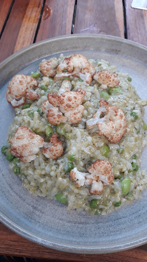 Beautiful location, good service, great music, and decent food. We had seen this place many times already, but just never got around to go there. And that's a shame, because it has a lot to offer. The drinks were good, but not perfect (half of the basil in my drink was brown and that is not nice). My wife had a plate of fried seafood and veggies with some sauces. Especially good to see different veggies there. But some had become just mushy, as if it was old. I had a green risotto with roasted cauliflower. Taste was great, but it wasn't really a risotto (it was dry and had the wrong rice). Both dishes were huge portions. They are starters, but could easily be eaten as a main course. Half the size would have been fine. The main course was mussels. Again a large portion, but we worked together on this one. Unfortunately, many mussels were closed. That means they were already dead and can't be eaten (you can get really sick from bad mussels). Then... don't serve them. Also, the bread was not as described on the menu. And part of the mussels were cold. As if they were leftovers that were later added to the rest of the (warm) dish. But he taste was great and that is most important. All in all... the place has beautiful potential, but should pay more attention to...