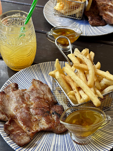 My dish was Grilled Pork Neck with Thyme and Garlic with Argentinian Chimichurri Sauce and Fresh Potatoes Fried in Beef Lard - nothing about that sauce was hinting toward chimichurri sauce! The fries were not fresh but frozen fries and tasteless. The meat was pleasantly tasty and kind of saved the entire dish.