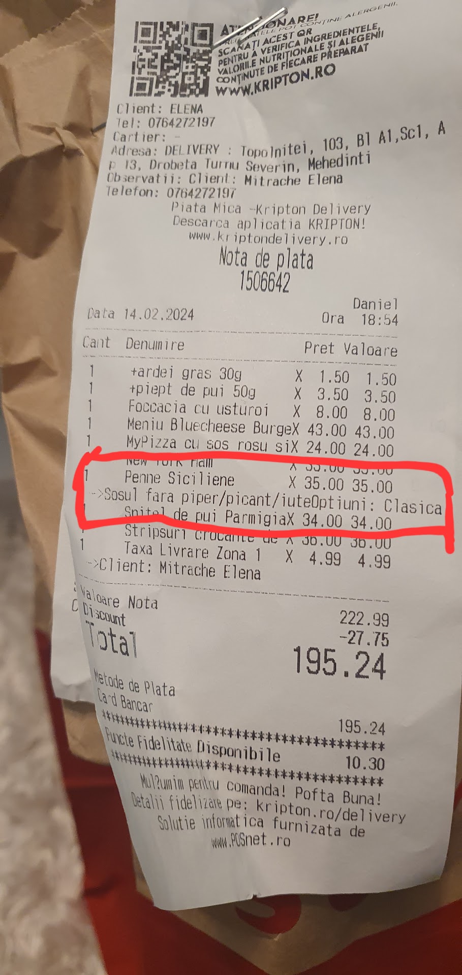 Read moreAm comandat o ciorba de perisoare cu o foccacia si pulpe de pui marinate cu cartofi french. Ce am primit? : Foccacia arsa bine,pulpele de pui la fel de arse si in loc de cartofi french am primit cartofi pai. Am mai patit sa mi aducă comanda incompleta au venit si au adus dupa restul. Iti piere toata pofta de mancare pana schimba ei comanda sau pana o completeaza. Sincer nu recomand ! CONTINUARE! Până seara am fost sunat si si au cerut scuze spunandu-mi ca de aceeasi suma pot comanda din nou si nu mai platesc. Totusi ceva ok pe langa alte restaurante care nu au citit nici macar recenzia. Toate bune si frumoase pana mi a ajuns livratorul. Mereu cand comand acasa vreau sa fiu sunat la telefon sa nu mi se bata in ușa. La unele restaurante nici nu mai trebuie sa specific acest lucru ca imi spun ei de cand fac comanda. Dupa ce am dat comanda am revenit cu telefon si am precizat sa fiu sunat sa nu mi se bata in usa. Livratorul mi a batut la usa. Mancarea a fist buna de data aceasta exact ce trebuia dar personalul nepregatit. Baieti tineri fara experienta probabil. Se lucreaza românește nu fac un lucru bun de la un capat pana la...