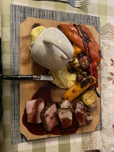 Minusuri: portii foarte mici (sigur nu respecta gramajul; gulasul sarac in continut: o bucatica de carne si cateva de cartofi) in raport cu preturile (la 2 portii de papanasi ni s-a spus ca nu au avut destul aluat, dar pe nota ne-au incasat ca portii normale, desi erau cat una - 50lei pe 4 gogosele - i-am spus chelnaritei ca o portie sa o considere ca bacsis), un pastrav cat palma si cu cartofi prajiti la 55lei?! desi in meniu limonada era cu menta, ni s-au adus doar cu lamaie, fara gheata si indulcite insuficient, dupa ce am platit cu cardul ni s-a dat doar ce a scos pos-ul pe motiv ca s-a terminat rola de la casa de marcat (la cerere mi s-a scris pe un biletel ce am comandat - aici am vazut ca ne facturase 2 portii de papanasi), debarasare greoaie; am vrut sa stam inaintru pt ca afara se fuma. Acolo era un miros de lemn invechit. Am dat o mana de ajutor ca si aici, afara, masa era nedebarasata, toalete mici.