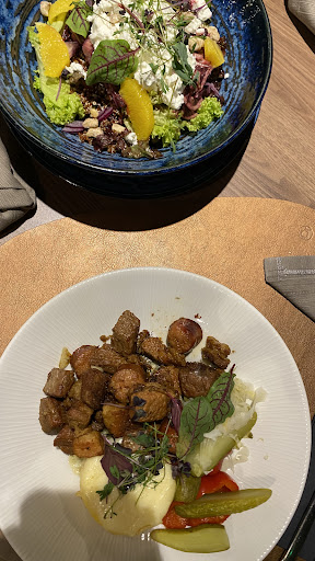 Tasty food, nice decor. Restaurant at 30-50% capacity and waited 40-50 minutes for the first dishes to appear. Ordered still water but got sparkling. After another 30 minutes of waiting we were told that they do not have the apple dessert anymore and asked to get only the other one we ordered - pumpkin pie. After another 20 minutes of waiting the other dessert was nowhere in sight. After another 20 minutes they brought the wrong dessert to our hotel room. We asked again for the correct one, which arrived 20 minutes afterwards and we gave back the incorrect one they brought the first time around. They apologised for the mistake and told us that the dessert is on the house. We were however surprised to find out that they charged us for 2 of the most expensive desserts...