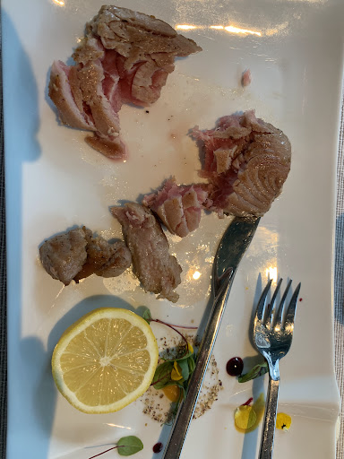 First, we were brought a delicious, complimentary starter. For our entrées, my buddy had STINCO DI MAIALE CON VERDURE (Oven Baked Pork Shank with Sautéed Vegetables); I had the PETTO D’ANATRA CARAMELIZZATO (duck breast with spicy sauce, sesame, and mixed pan-fried mushrooms, which also came with some awesome mashed potatoes); and my wife had the FILETTO AL TARTUFO (beef fillet with truffle crust). For dessert, we shared NOUGAT GLACÉ, which we were ecstatic about because not only was it so good, but it's gluten-free, and my wife is celiac.
