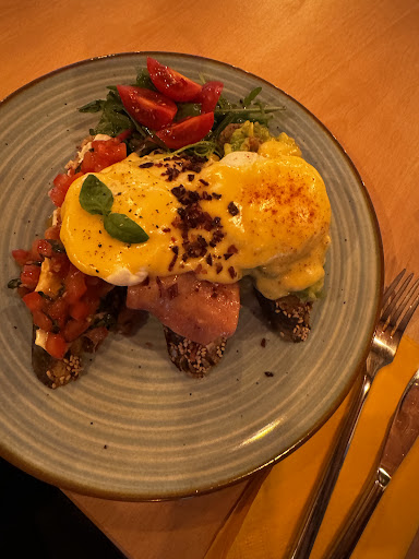 The coffee stood out. It had an exotic, bold flavor that lingered delightfully, something I particularly appreciate in a cappuccino, where the bean’s character often fades. This choice of bean brought a unique, satisfying depth to the cup. The meal itself was exceptional. The poached eggs were perfectly cooked, with the yolks flowing just right. The bread was a revelation, crunchy on the outside and soft on the inside, maintaining its integrity under the toppings, which is no small feat. Despite being loaded with ingredients, it avoided becoming soggy, which shows excellent attention to detail by the kitchen. Hats off to the team, they clearly know what they are doing. I would happily return in the future.