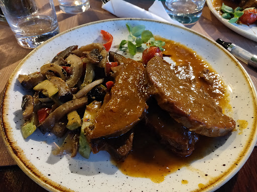 It was a bitter-sweet experience on our side. we were a big group, 9 people, and we had heard about the place being very good so we decided to make a booking and go. We were called during the day of the booking to confirm the reservation, we confirmed and we were not told anything else. when we arrived there for dinner, we discovered that they also had a wedding in the restaurant. And it wasn”t in a separate place, no. the wedding was in one side of the restaurant, and our group (and the rest of the people who came to the restaurant that evening) was in an adiacent room to the wedding, but there was no door between the 2 places, you had to pass by the wedding party to get to the toilet, the waiters had to pass by the wedding party to come to us with the food, everything happened passing by the wedding. Also, at the beginning, there was the live very loud music singing at the wedding which overlapped with the music in our place, the general music from the restaurant. this was awful, we could not hear each other, we could not listen to either type of music, absolutely awful, especially for some members of our group who were a bit older and did not enjoy at all this aspect. in the end they stopped the music from the loudspeakers and we could only hear the music from the wedding, which was still extremely loud for some of us. on the other hand, the service was not the absolute best - the waiter was good, he did his best, but you could see he is not a great communicator. But as a waiter, all was ok, he explained certain things, he brought the food, all ok. The food, on the other hand, was absolutely divine! we took the bear steak - it melts in your mouth. The duck breast with cherry sauce - absolutely divine, I will definitely go back for it! also the other members of our party were happy with the food (except the person who ordered the steak with butter. they ordered it medium-rare and it was practically a shoe sole.) Dessert was very good, as well, although it doesnt match the level of food they have - I was expecting something more spectacular than crepes susette (which were very tasty and they made at the table on the mobile stove - for the show. taste was good), papanași and lava cake - correctly made, very tasty, but i was expecting more variety, more wow stuff, according to the level of the food. So all in all, if you separate the part with the wedding, the experience was ok and we would recommend the place. It was not professional from them the fact that when they called us to confirm the booking, they did NOT tell us that they also have a wedding and it is not separated from the other clients. We would have not gone there that evening because some of us are very sensitive with the level of music they can listen to and they just put us in front of it when we arrived and we had to deal with it. Also I don”t know how pleasant it was for the wedding party to keep having intruders mixed up with them - so not good all in all. but apart from all this, food is amazing and assuming they dont have a wedding there every day :), I would definitely recommend the place! Go and order the bear steak and duck breast with cherry sauce. you will thank...