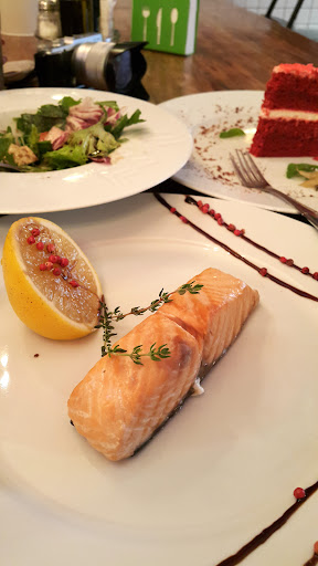 This place was just lovely! very nice place for a brunch, coffee and cakesss... We were so tired the other day after walking every day for over a week by then in our trip, so we just pick the closest restaurant we saw and sit down. hah Then we were attracted by its ambience, the nice decoration and homey feeling it gave us. Music played in the background was easy and relaxing, the host was friendly enough especially for foreigners like us. Not speaking any Russian, we could communicate easily in English to order our food and they did provide English menu. regarding Food !, first thing first, it's dessert. haha, yes, I love the red velvet cake so much, tons, it's really moist and juicy inside ! this is my favourite kind of cake baking. I was not suspicious before it was put to the table, but I was struck hard by its delicious moisture and taste! And for the mojito, it's fresh and thirst quenching as it was summer when we visited. Everything they put down to the table gave us a wow, and pan-fried salmon is no exception, it tasted like the quality we tried at the hotel Savoy in Moscow. This place was a surprise to me and would really like to revisit next...