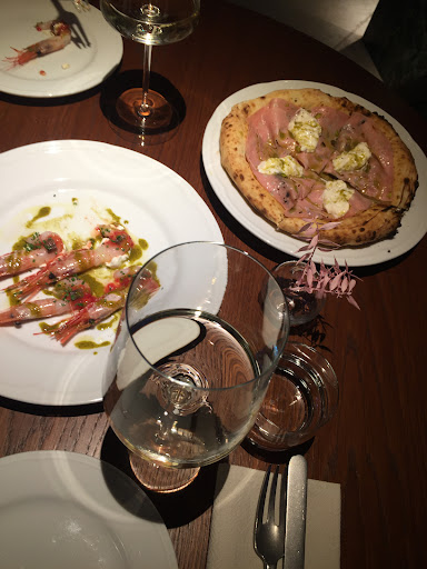 Пицца (которая лепёшка) с мортаделлой и фисташками-неплохо, но слишком солёная. Закуска со свежими креветками-на 4. Паста с ежами - на 3.