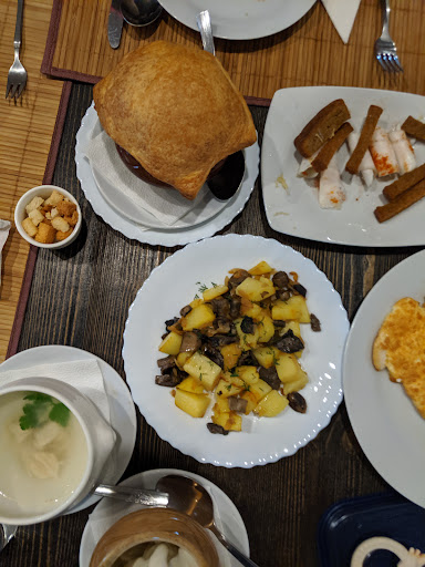 С удивлением читаю восторженные отзывы про это место. Были в Суздали посреди недели, туристов очень мало, возможно этим было обусловленно отвратительное качество блюд. Борщ был просто ужасен: бледно серо-розового цвета, такого цвета был не только бульон, но и овощи, включая свеклу. Видимо, из-за того, что борщ был приготовлен очень давно, весь цвет из неё просто выварился. Сметана почему-то была уже в борще. По вкусу это был не борщ, это вообще непонятная субстанция была, чуть кисловато-солоноватая водичка. Съедено было всего несколько ложек, чтобы всё-таки адекватно оценить блюдо. Официантка, забирая полный горшочек, поинтересовалась, что не так и пообещала вернуться с комментариями от кухни. Естественно, этих комментариев мы не дождались, и борщ этот благополучно был записан нам в счёт. Ну что ж, возмущаться не стали, оплатили, но осадок остался. Блинчики - ну чисто столовские, по внешнему виду сразу становится всё понятно: не ожидайте вкусных нежных блинчиков, сухие, спасло их только варенье. Вареники с луковой зажаркой оказались самым вкусным блюдом, ну как вкусным, на тройку. Зажарка - это почему-то варёный лук оказался (подаются в горшочке с луком и сметаной внутри). Не понимаю что за желание сметану во все блюда добавлять самим, это должен делать гость по своему усмотрению.. В общем, полное разочарование кухней и сервисом. Худшее место в Суздали. Лучше добавить к каждому блюду по 50-100 рублей и поесть в достойных заведениях, коих в...