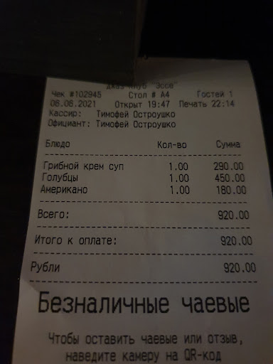 Read moreВроде бы всё предвещало все 5 звёздочек в отзыв, пока дело не коснулось кухни! Заведение новое, тематически интересное для узких кругов, ценник средний и приемлемый, но еда, в частности фирменный бургер "Эссе" (на минуточку!) при стоимости почти в 500 руб. был подан в чёрствой булке и с резиновой ужасной котлетой, что даже сложилось впечатление, что этому бургеру исполнилось на момент подачи уже несколько дней, а то и недель ))))), пицца - это вообще нечто непонятное оказалось, что язык даже не повернулся бы это пиццей назвать - всё это убило замечательное первое впечатление о заведении. В общем главная фишка этого места - музыка, так что приходите слушать джаз...