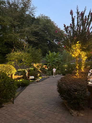 Дочка подарила сертификат на 5000 рублей на 23 февраля и заказала столик в основном зале. Приехали заранее, походили по прилегающей территории. Восторгались всеми уголками, разными фишками и другими прелестями, которые увидели на территории и вокруг ресторана. Встреча, обстановка, интерьер и обслуживание на высшем уровне. Все блюда очень понравились. Великолепная подача. Правда, в прошлый раз тыквенный суп подавали в тыкве и с сухариками, в этот раз подачу изменили, но и вкус изменился не в лучшую сторону. Обалденный вкус у баклажана – просто тает во рту. Мне очень понравилось. Цены высокие, но с учётом оформления прилегающей территории, интерьеров, обслуживания и обалденной кухни – соответствуют действительности.