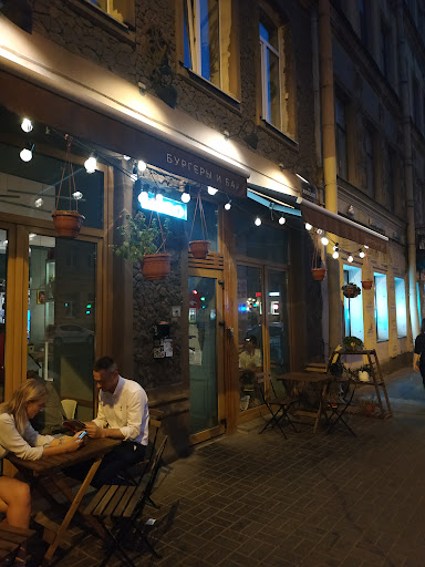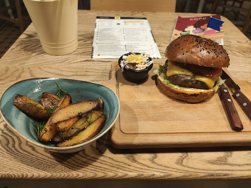 Read moreСетевая бургерная-бар. Большой выбор разных бургеров. Меню периодически обновляется. Есть возможность выбрать булочку (5 вариантов), прожарку (medium по умолчанию) и размер котлеты (2 размера, большая котлета на фото). К бургерам прилагается на удивление вкусный коулслоу. С прожаркой и размером котлеты стоит быть осторожным. Бургеры рассчитаны на стандартный размер, так что с большой котлетой есть риск, что всё начнёт разваливаться. Также с большой котлетой выше риск, что напортачат с прожаркой. Мой medium получился чем-то средним между medium rare и rare. В центре котлета вышла ярко розовой, а фарш это не стейк, так что есть риск просто получить несварение. Если не считать этого, то бургер был вкусным и сбалансированным. Картошка-айдахо очень масляная и без корочки, так что не рекомендую. Интерьер приятный. Играет инди-рок. На стенах работы современных художников, которые периодически обновляются. Днём до 17 скидка 10% на еду. Весь день скидка на вынос. Цены чуть выше среднего по городу. Стоит того, но будьте осторожны...