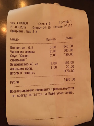 Von außen eher wie eine Bierkneipe, Musik läuft schon auf d. Straße ganz laut. Innen mehrere große Räume, Musik hier aber eher gedämpfter. Die Wände sind auf Fachwerk getrimmt, an der einen Wand, im Raum in dem wir dann gegessen haben, steht "besser ein kleiner Fisch, als garnichts auf dem Tisch" leider nicht ganz fehlerfrei.. Aber mai..wir sind doch in st.petersburg. Eine überwältigende Bierkarte und eine überschaubare Speisekarte. Und ich muss sagen, man bekommt hier Essen fast auf Sternenieveu. Für die Fleisch-Liebhaber gibt's Steak, Hirschgulasch, Würstchen und sogar 20 Std. Souc vide in bier gegarte Haxe, für die Fisch Liebhaber gibt's kross gegrillten Lachs auf Senfkorn- Kartoffelpürree, mit einer himmlischen süßerSenf Sauce und auch Forelle Müllerinart, zur Vorspeise einige Salate mit gegrilltem Kalb oder einfach Cesars Salat, Suppen unter anderem Pilzrahmsuppe und auch die typisch russische Fischsuppe "Ucha"= уха, allerdings neu interpretiert, aus Räucherlachs. Zum Nachtisch gibt es die Auswahl von 4 Gerichten, Strudel mit Apfel-Birne, mit Moosbeeren, jeweils mit Eiscreme, Eisbecher und dann noch den Wahnsinn aus Schokolade "Schokoganache" mit betrunkenen Kirschen. Am ersten Tag lernten wir sogar den Koch kennen. Top, ihm haben wir natürlich unsere Glückwünsche für die tolle Küche übermittelt- Top!!! Kann man nur weiter empfehlen! Für 3 Personen, mit reichlich Getränken, Vor- Haupt und Nachspeise zahlten wir 4.000 ₽ = 59€ also etwa...